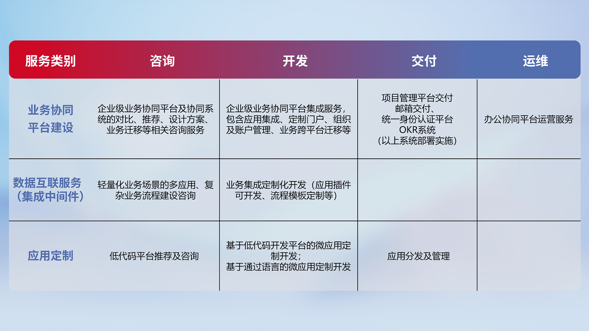 针对钉钉、、、企微、、、IDaas等平台级产品提供产品的规划、、、方案、、交付、、、定制化开发等服务,,实现如统一协同办公、、、智能客户服务、、、混合会议管理、、、智能数据查询、、、、等业务场景,,,,实现数字化转型。。。。