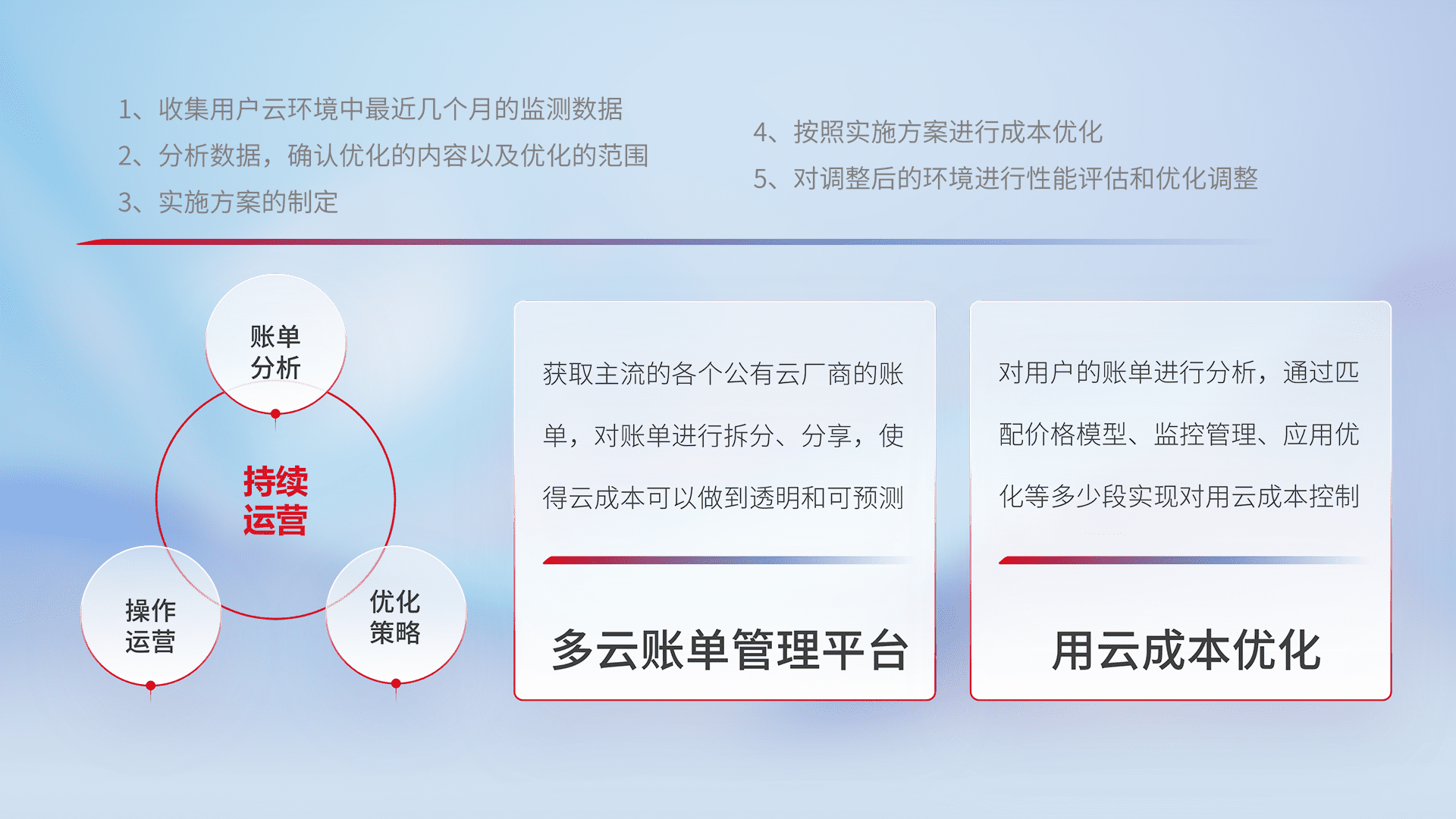 通过多云纳管,,以统一的资源数据模型把客户的云资源进行抽象和封装,,进而实现对多云资源的统一操作,,,,保障云资源管理的可靠性、、稳定性与可用性。。。。量身定制化运维内容,,配置、、、开发运维、、、补丁管理、、、、备份、、、监控、、认证和访问管理、、、、审计和日常巡检等,,保障在用云过程中的可靠度,,稳定度以及高可用率。。。。